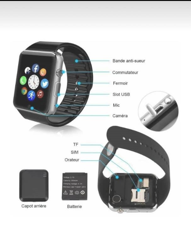 MONTRE PORTABLE AVEC CARTE SIM, CAMERA, Bande anti-sueur, Port USB